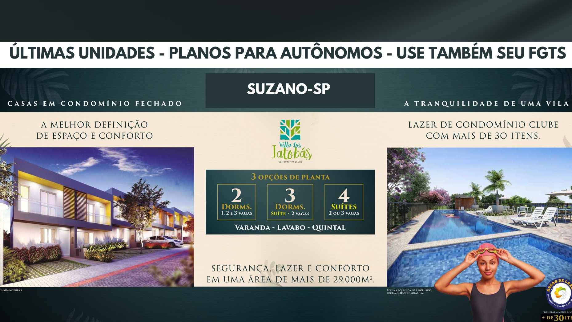 Depois do sucesso do Villa das Paineiras - vem aí o segundo empreendimento o Villa dos Jatobás um condomínio de casas de 2 dorms. com 1 ou 2 vagas, 3 dorms. com suíte com 2 vagas. 4 suítes com 2 ou 3 vagas. Com mais de 30 itens de lazer entregues equipados e decorados.